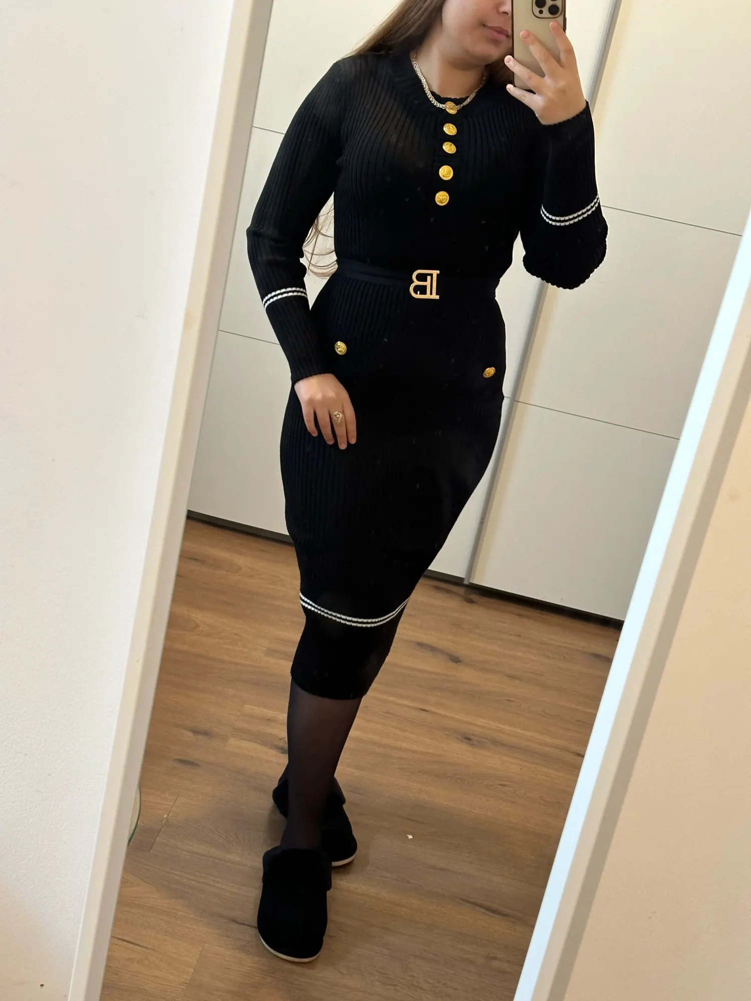 B Buckle Belted Gold Button Midi Ribbed Dress